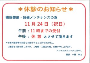 令和7年11月24日は機器整備・設備メンテナンスの為11時までの受付